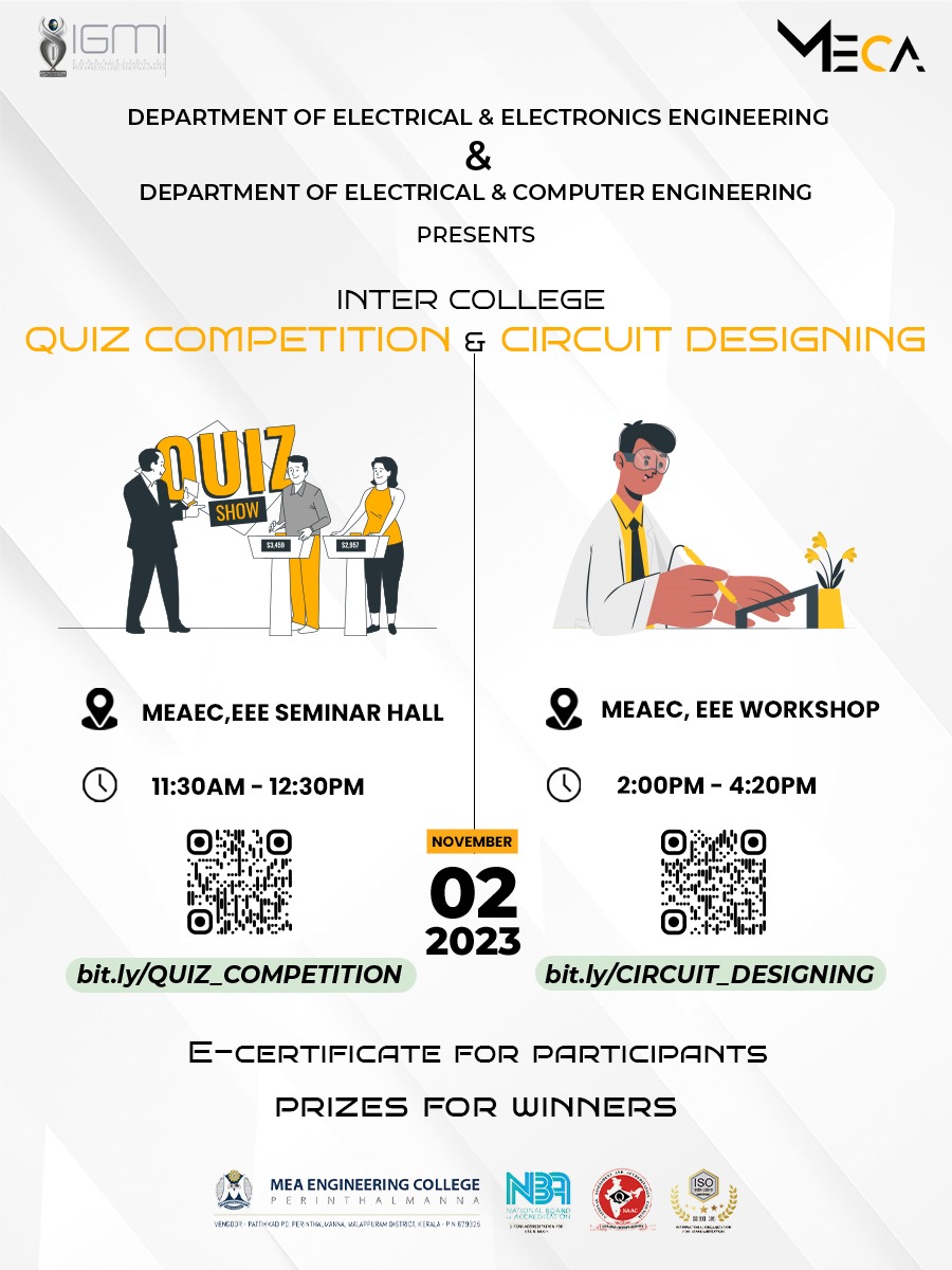 The Association of Dept. of Electrical & Electronics engineering, IGMI in collaboration with MECA (Association of Dept. of Electrical & Computer engineering) organized an Inter College Quiz Competition and Circuit Designing Competition on 2 nd November 2023 at depatment Seminar Hall and Workshop respectively. Event was inaugurated by Dr. Febina Beevi. P (HOD, EEE). Mr. Jithin Mohan K S, (Facullty advisor-IGMI) welcomed the gathering. There after the Quiz competition was conducted by Quiz master Mr. Muhammed Bava K H, (Assistant Professor-S&H), MEA Engineering College.