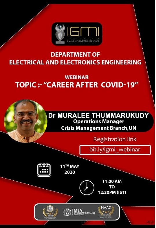 EEE Department of MEA Engineering college has Organized a Webinar on the topic “CAREER AFTER COVID-19” on 11th May 2020 from 11 AM to 12.30 PM. Dr. Muralee Thumarakudy ( Operations Manager, Crisis Management Branch, UN) was the chief guest. Mr. JITHIN MOHAN K.S. (Faculty advisor, IGMI).. welcomed the gathering and keynote address was delivered by Dr. FEBINA BEEVI. P (HOD, EEE). Students from various semester of EEE department were participated in the event.